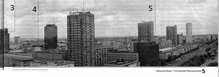 (3) przy placu Napoleona, został opanowany przez powstańców 1 sierpnia. Zawisła na nim biało-czerwona flaga. Gmach został uszkodzony eksplozjami ciężkich niemieckich pocisków, a moment ten utrwalił na słynnych zdjęciach Sylwester Braun „Kris". Powojenna odbudowa zmieniła zewnętrzny wygląd Prudentialu. Nowy inwestor ma podobno przywrócić mu pierwotną postać. Z PAST-y widać, na rogu Jasnej i Świętokrzyskiej, gmach PKO z kopułą (4). Był on przez kilka dni, na przełomie sierpnia i września 1944C, siedzibą Komendy Głównej AK po jej przejściu ze Starego Miasta. Budynek PKO był bombardowany; poważnie ranny został wówczas gen. Tadeusz Pełczyński, szef sztabu KG AK. Nieciekawy budynek biurowy (5) kryje w sobie część murów zniszczonej podczas powstania okazałej przedwojennej kamienicy towarzystwa ubezpieczeniowego Rossya, o czym świadczy zachowana klatka schodowa.