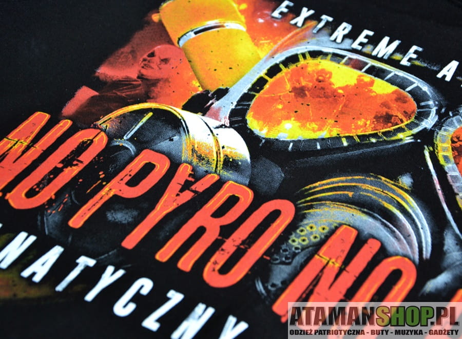 Hasło No Pyro No Party od lat kojarzy się z atmosferą stadionową, w której race i flary tworzą wyjątkowe widowisko. Duży, biały napis na czarnej bluzie jest doskonale widoczny i symbolizuje prawdziwego kibica, który wie, że bez pirotechniki nie ma prawdziwej zabawy. Grafika z motywem flar i stadionowego klimatu nadaje bluzie charakteru i sprawia, że nie da się przejść obok niej obojętnie.