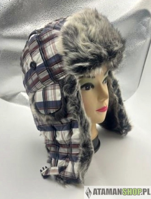 Czapka Pilotka w Kolorową Kratkę z Futerkiem Szaro-Białym – Stylowa i Ciepła Ochrona na Zimę