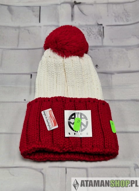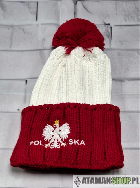 Czapka zimowa kibicowska biało-czerwona z pomponem – Polska, patriotyzm, haftowany Orzeł i napis „Polska”