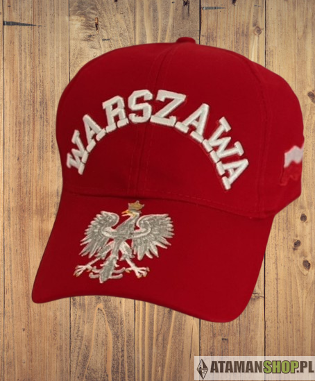 Czapka z Daszkiem Czerwona Patriotyczna z Napisem Warszawa i Haftem Orzełek Biały