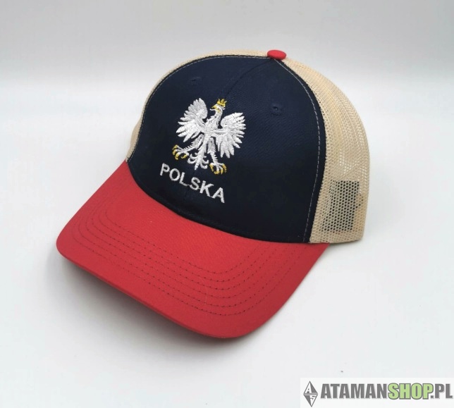 czapka patriotyczna, czapka Polska Orzeł, czapka z daszkiem, czapka z siatką, czapka sportowa, czapka letnia, czapka na lato, czapka granatowo-czerwona, czapka polska produkcja, czapka męska patriotyczna