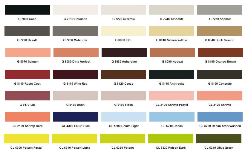 różne kolory do wyboru po numerze lub nazwie koloru