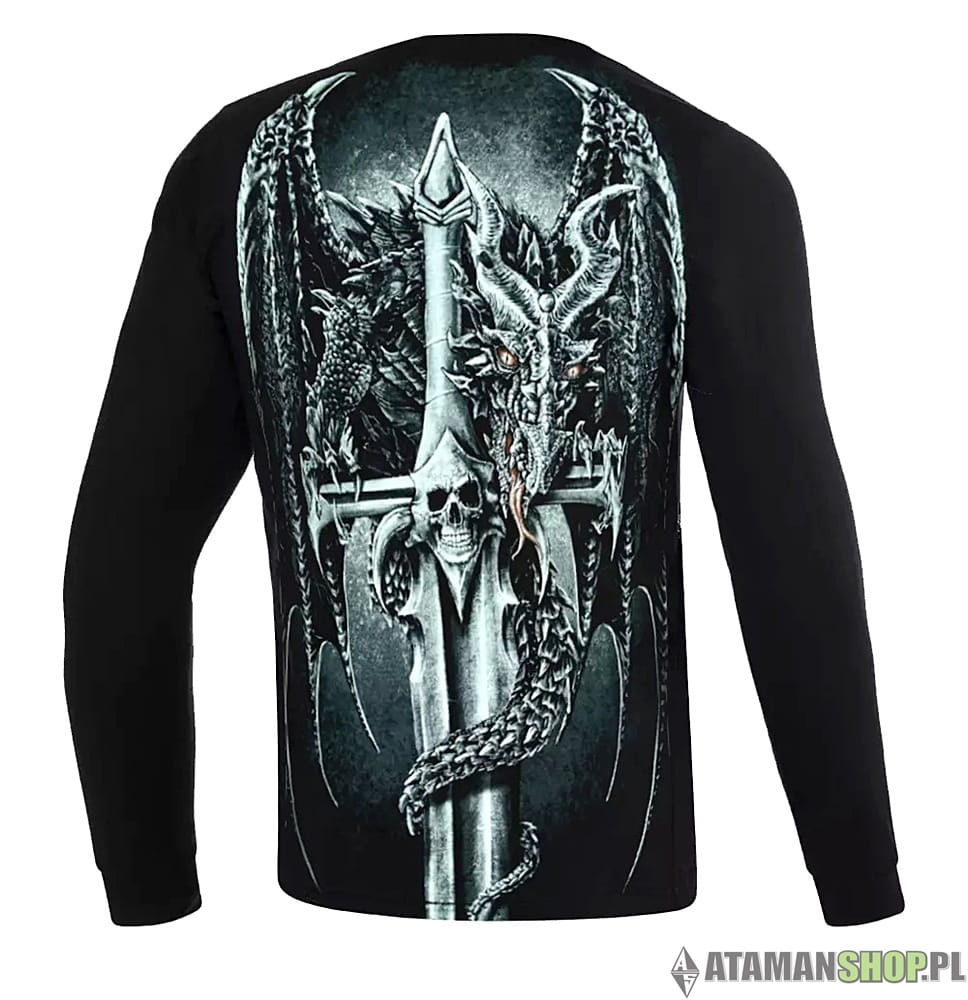 Wyjątkowa koszulka z długiem rękawem sportowa z wizerukiem smoków koloru czarnego z dużych rozmiarów nadrukiem z motywem fantasy. Wykonana przez polskiego producenta odzieży - Fightershop. Podczas projektowania oraz wykonania koszulki zadbano o jej najdrobniejsze detale. Nadruk na koszulce wykonany został przy pomocy sitodruku. Jest bardzo trwały i nie ulega zniszczeniu podczas użytkowania. Produkt należy prać w temperaturze nie przekraczającej 40 stopni, pozwoli to zdecydowanie dłużej zachować trałość nadruku.