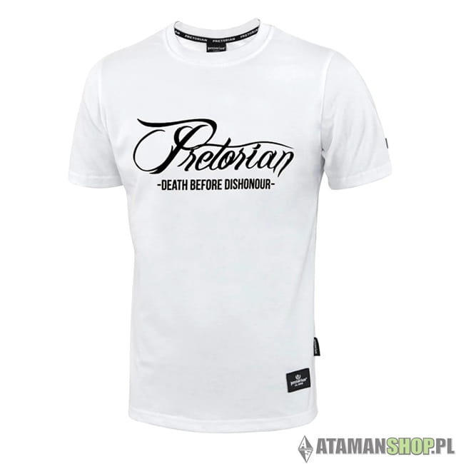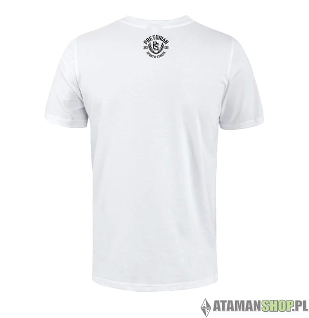 Na froncie koszulki znajduje się duży, charakterystyczny napis Pretorian, który jest symbolem rozpoznawalności, determinacji i wytrwałości. Projekt graficzny jest prosty, ale przyciąga uwagę – biel materiału kontrastuje z mocnym logotypem, podkreślając sportowy i męski charakter odzieży. Koszulka została zaprojektowana tak, by reprezentować styl życia oparty na dyscyplinie, sile i niezależności.