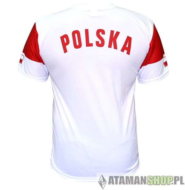 Nadruk Polska Orzeł na koszulce wykonany został metodą sublimacji, jest bardzo trwały, nie ulega uszkodzeniu w praniu oraz nie zmienia koloru. Produkt należy prać w temperaturze nie przekraczającej 40 stopni, pozwoli to zdecydowanie dłużej zachować jego trwałość. Koszulka wzorowanach jest na piłkarskich koszulkach Reprezentacji Polski. Wykonana została w całości z poliestru, jest bardzo lekka. Doskonale nadaje się na imprezy sportowe oraz do codziennego użytkowania.
