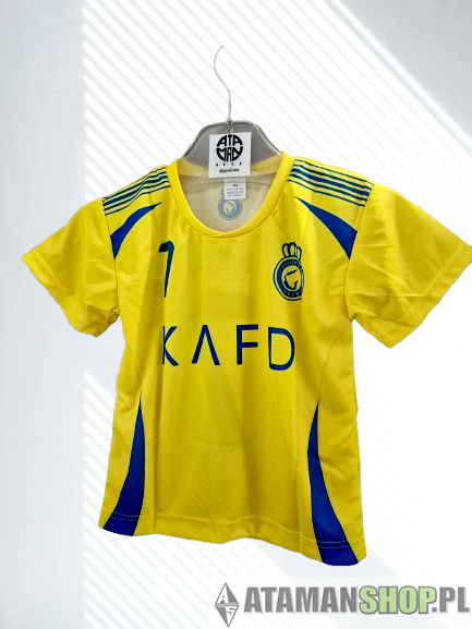 koszulka Ronaldo dla dzieci, koszulka Al-Nassr 7, żółto-granatowa koszulka piłkarska, polska produkcja odzieży sportowej, koszulka treningowa dziecięca, strój piłkarski dziecko, koszulka sportowa chłopięca, koszulka futbolowa dzieci
