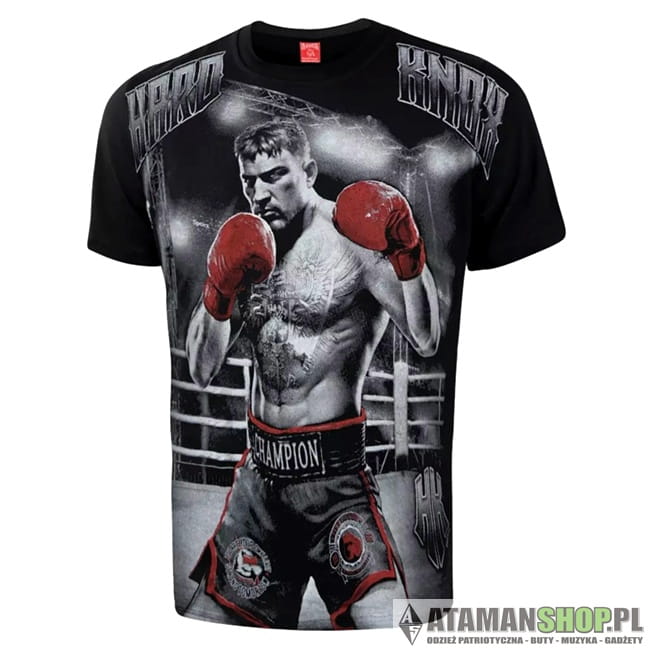 Nadruk na tej koszulce przedstawia boksera w akcji z rękawicami bokserskimi, co natychmiast przyciąga uwagę i wyraża dynamikę oraz siłę sportu. Taki motyw symbolizuje waleczność, determinację i zapał do walki – cechy, które są kluczowe w boksie i innych sportach walki. Rękawice bokserskie to klasyczny symbol tej dyscypliny, który dodaje koszulce sportowego, męskiego charakteru. Bokser na nadruku może być przedstawiony w pozycji gotowej do ciosu, co podkreśla energiczny i mocny styl.
