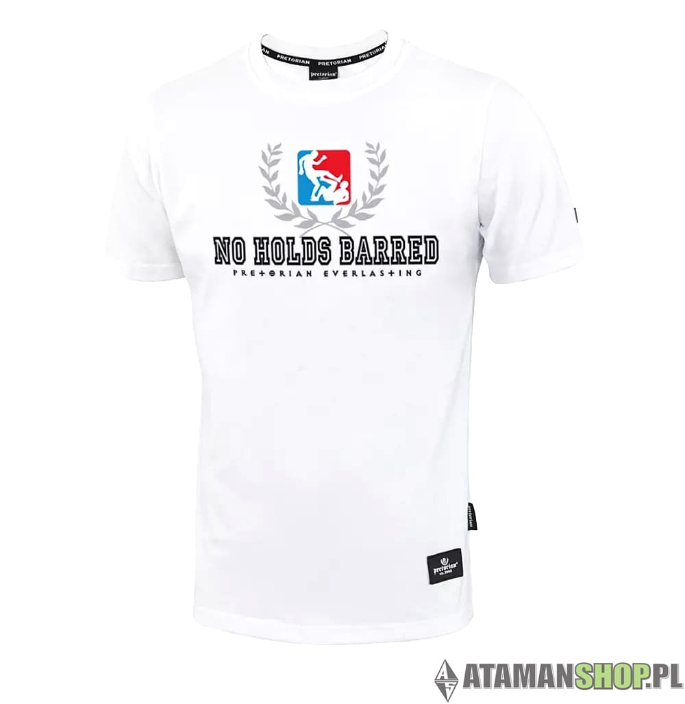 Biała koszulka marki sportowej z estetycznym i dopracowanym nadrukiem. Jeden z mocniejszych wzorów marki Pretorian z bezkompromisowym hasłem" No Holds Barred". Koszulka posiada duży nadruk z przodu oraz niewielki z tyłu na wysokości karku. Koszulki marki Pretorian cechuje najwyższa jakość wykonania oraz dbałość o najdrobniejsze szczegóły i detale. Idealna koszulka do codziennego użykowania.