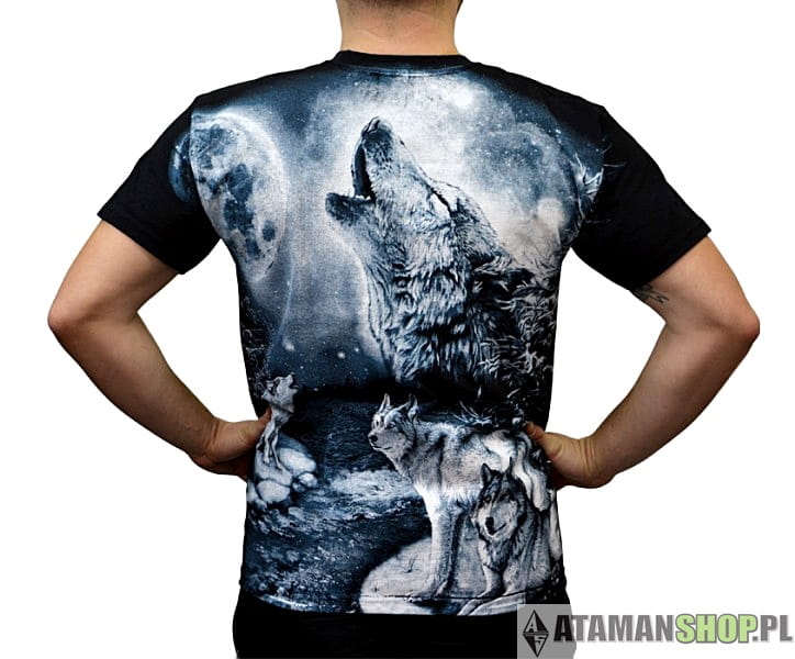 Centralnym punktem koszulki jest efektowny nadruk wilka wyjącym do księżyca w pełni, wykonany w technologii druku HD. Tło często przedstawia nocny krajobraz – las, gwiazdy, góry – tworząc niezwykły klimat i wyrazisty kontrast z materiałem koszulki.