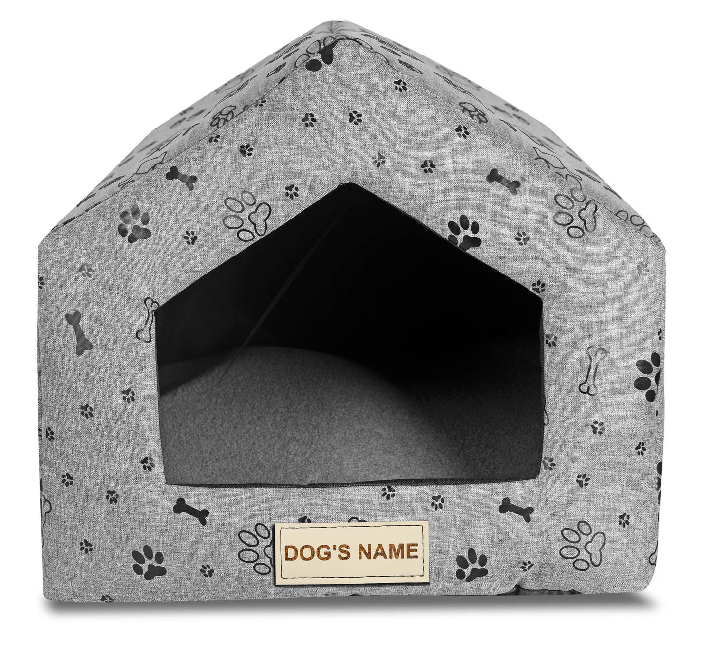 Wytrzymałe wodoodporne legowisko DOMEK dla psa KOŚCI CZARNE w kolorze szarym, PERSONALIZOWANE imieniem pupila!