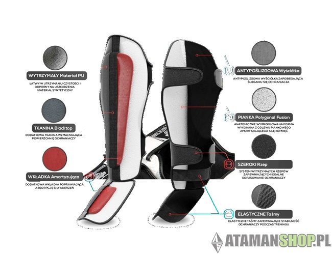 Piszczele są jednym z najbardziej narażonych miejsc podczas treningów sportów walki. Ochraniacz został zaprojektowany tak, aby skutecznie chronić nogę przed uderzeniami powstającymi podczas kopnięć oraz blokowania technik przeciwnika.