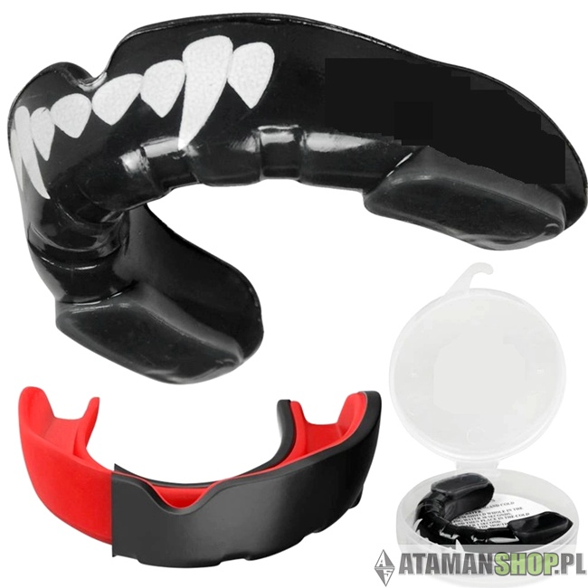 Żelowy ochraniacz na zęby czarny z białym wzorem kłów + pudełko – podwójna ochrona szczęki