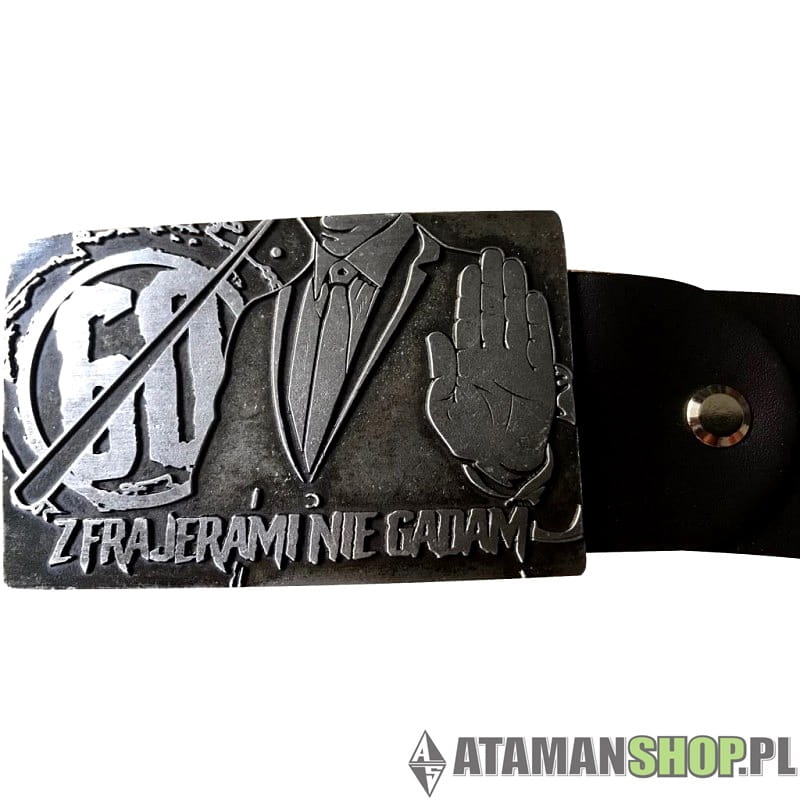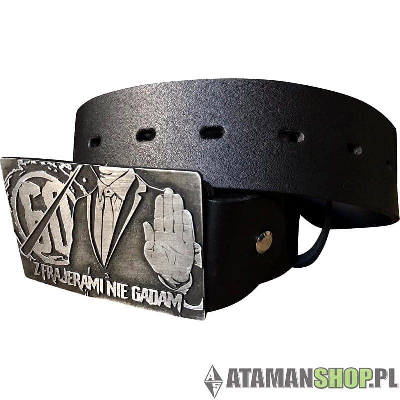 Elegancki, solidny pasek wykonany z doskonałej jakości skóry naturalnej z wytłoczonym motywem na klamrze "Z Frajerami nie gadam".