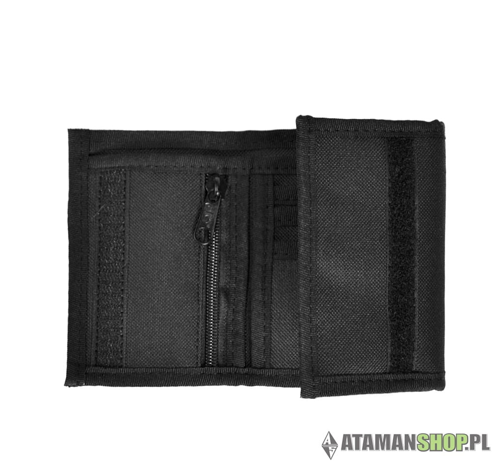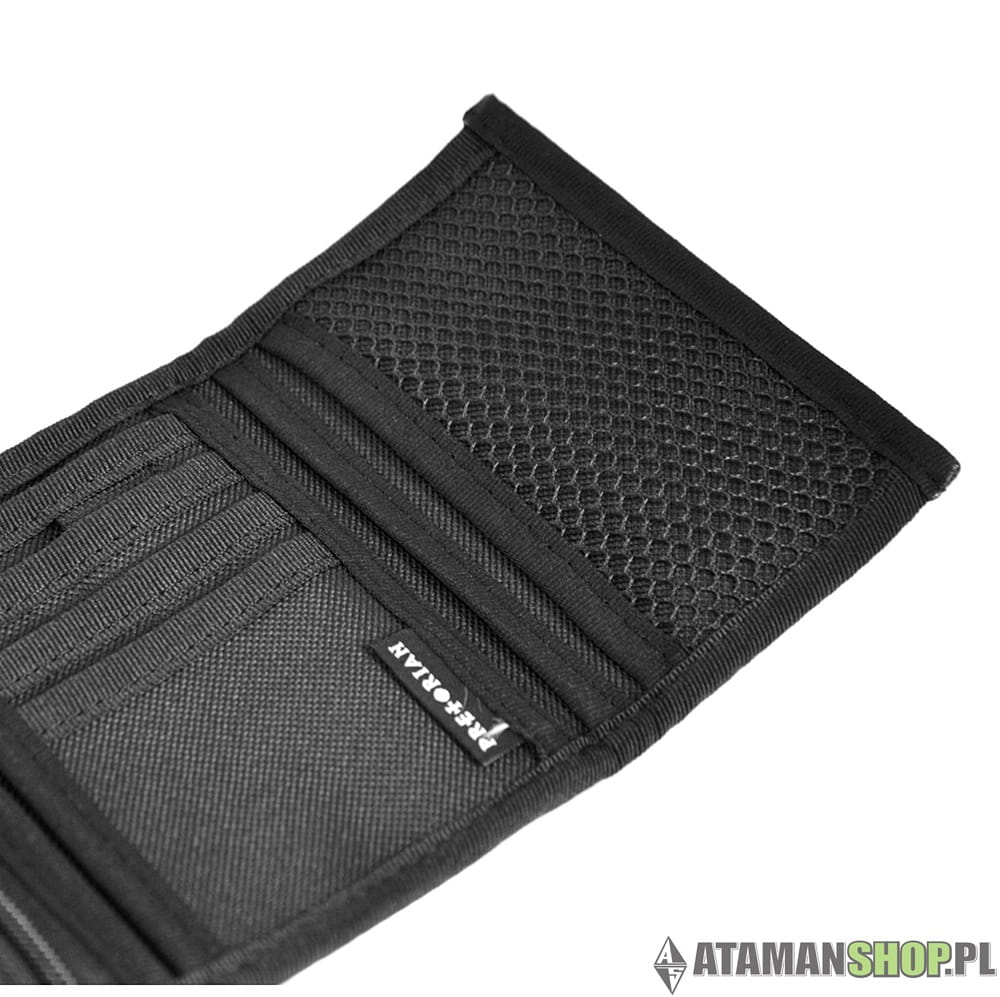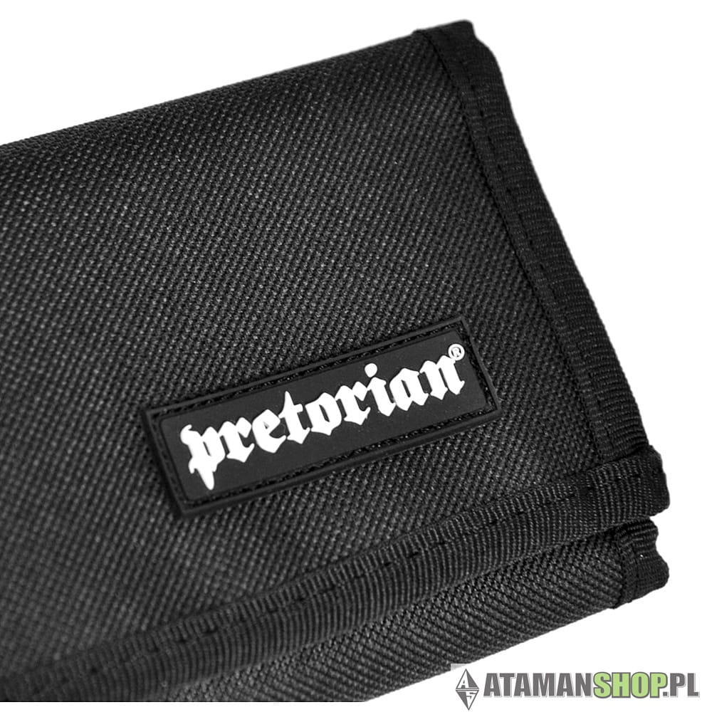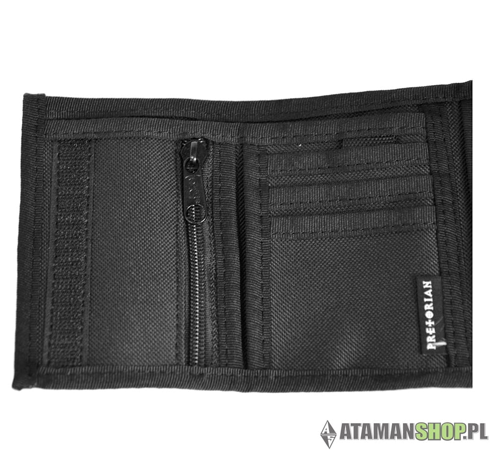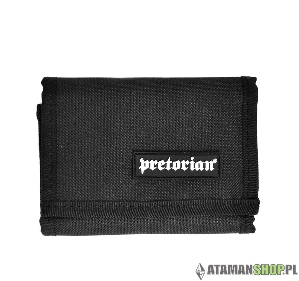 Czarny sportowy uliczny klasyczny portfel materiałowy marki ullicznej. Z przodu znajduje się naszywka gumkowa z logiem Pretorian. W środku firmowa metka. Portfel posiada dwie kieszenie, zamykane na suwak. Zewnętrzna kieszeń na banknoty. Sporo funkcjonalnych przegródek na karty płatnicze.