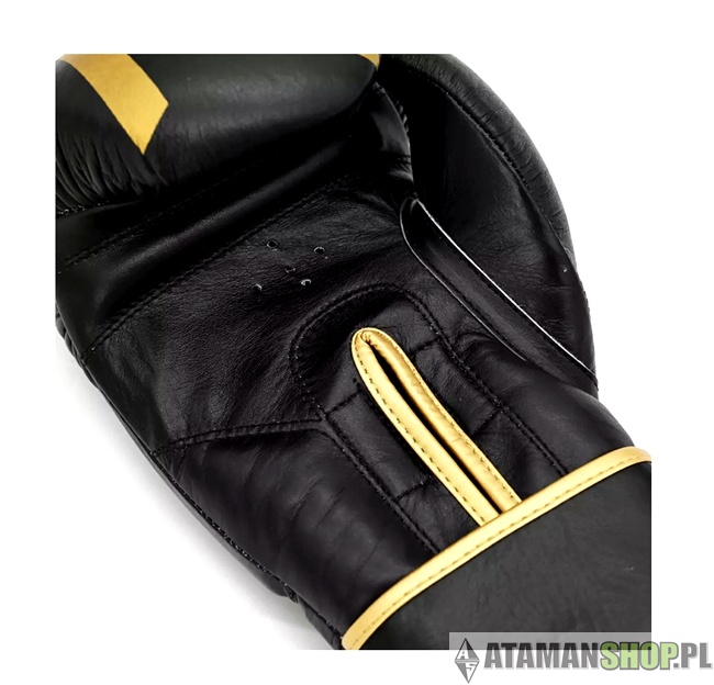 rękawice bokserskie skórzane, rękawice do Muay Thai, rękawice kickboxing, rękawice czarno-złote, rękawice z systemem Wrist Band, rękawice polska produkcja, sprzęt sportów walki