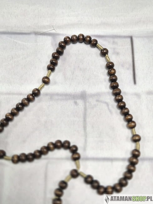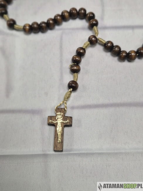 Drewno jest materiałem symbolicznym – od wieków kojarzonym z naturą, skromnością i pokorą. W kontekście różańca ma dodatkowe znaczenie – przypomina o krzyżu Chrystusa, wykonanym również z drewna. Ciemnobrązowy kolor paciorków nie tylko nadaje różańcowi klasyczny wygląd, ale również odwołuje się do duchowości franciszkańskiej oraz zakonnego ubóstwa.