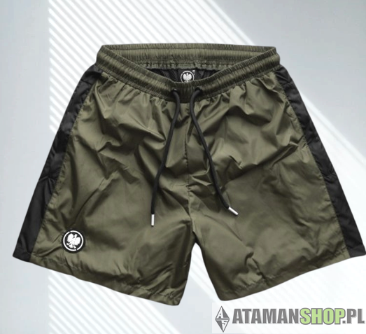 Spodenki sportowe patriotyczne khaki/czarne z Orzełkiem – lekkie, funkcjonalne, z dumą zaprojektowane