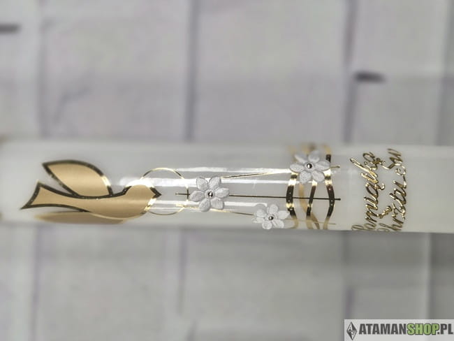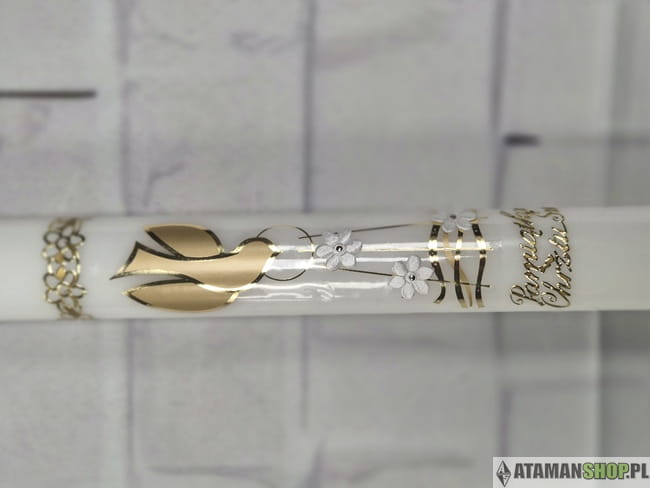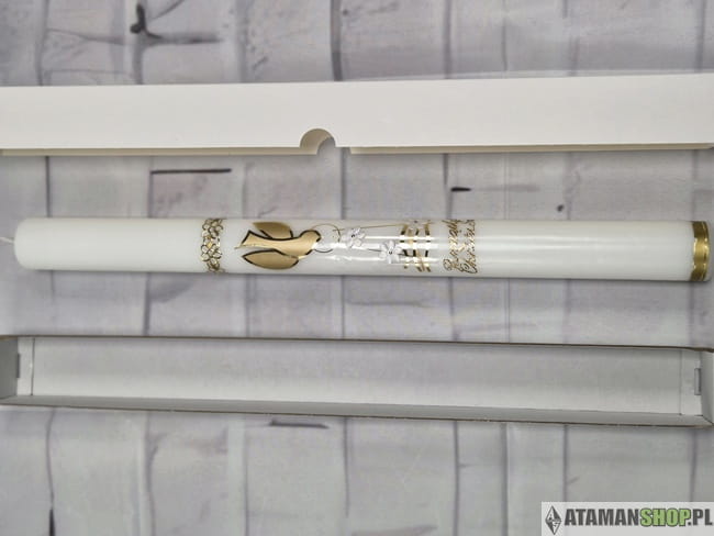 Biała świeca ozdobna z gołębiem i złotymi wzorami nie jest zwykłym przedmiotem – to pamiątka, która z biegiem lat nabiera coraz większego znaczenia. Przechowywana w rodzinie przypomina o dniu, w którym dziecko zostało włączone do wspólnoty Kościoła. To wyjątkowy symbol wiary i nadziei, który można przekazać kolejnym pokoleniom.
