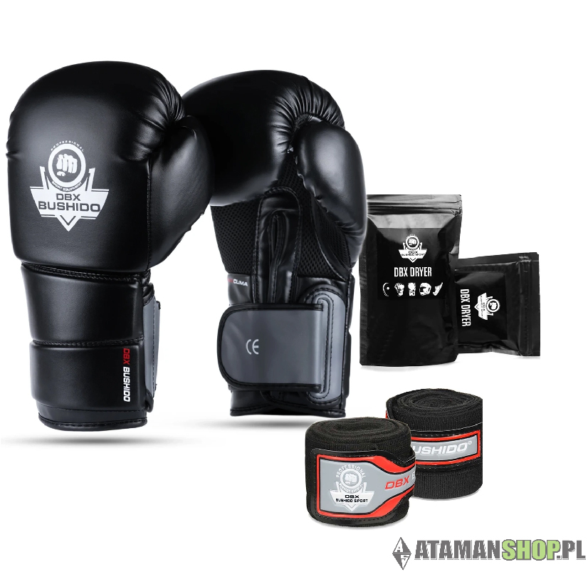 Zestaw DBX Bushido Eclipse to gotowy pakiet dla osób trenujących sporty walki, który łączy podstawową ochronę dłoni z elementami dbającymi o higienę sprzętu. W komplecie znajdują się rękawice bokserskie, owijki stabilizujące nadgarstek oraz odświeżacz DBX DRYER.