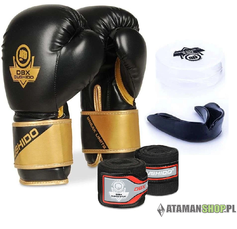 Rękawice bokserskie, szczęka, owijka – komplet treningowy