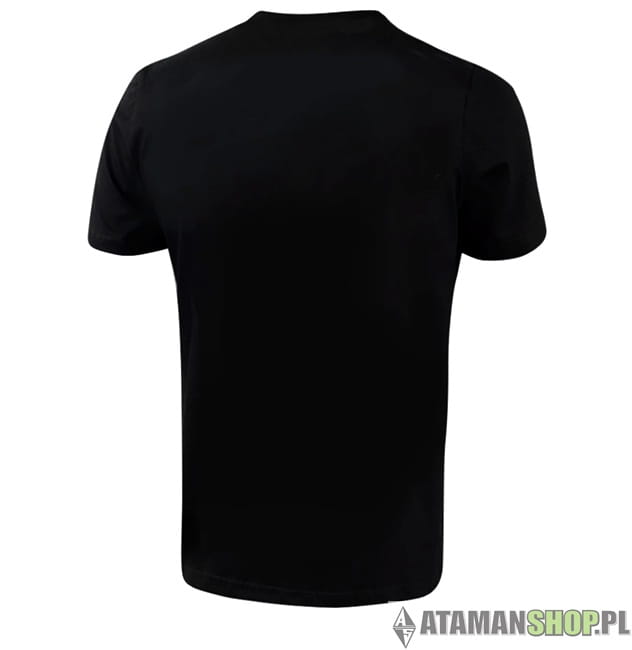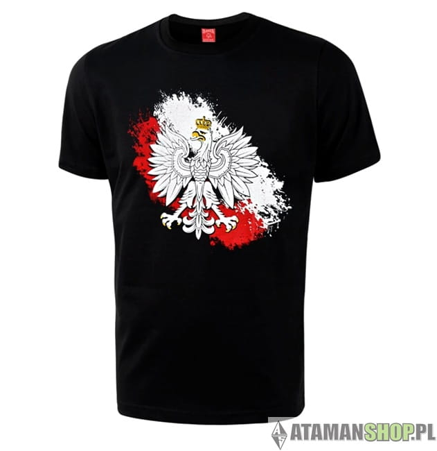 koszulka Orzeł flaga czarna z nadrukiem z przodu duży nadruk Orzeł z koroną złotą, flaga Polski, produkcja Polska.
